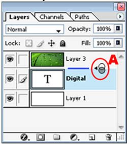 Tekan dan Tahan tombol ALT kemudian arahkan kursor diperbatasan antara Layer gambar dan Layer Teks (ditandai garis biru pada gambar diatas), jika posisi kursor telah pas otomatis kursor akan berubah (lihat simbol yg lingkari merah pada gambar diatas), kemudian kamu tinggal KLIK. Jika langkah kamu benar maka gambar akan masuk kedalam Teks